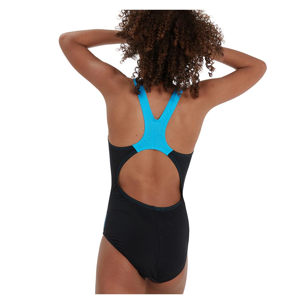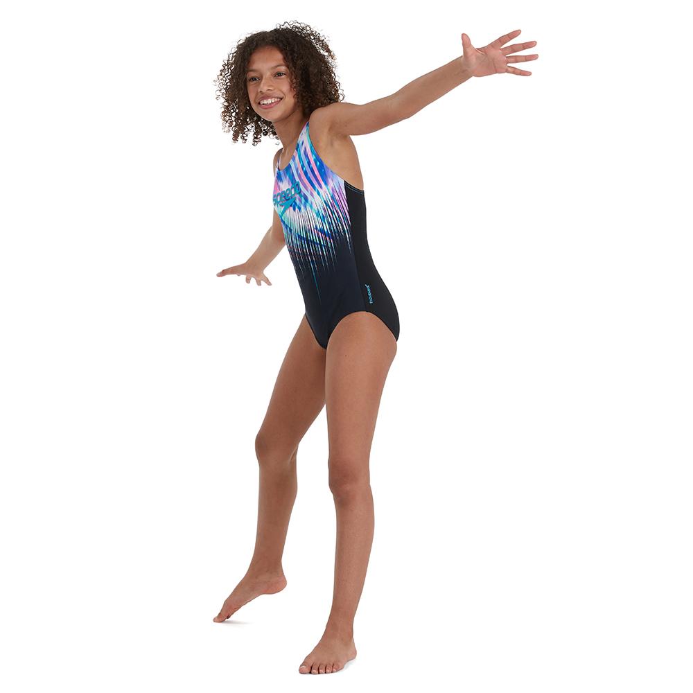 Look great and feel confident in this Speedo Girls Digital Placement Splashback Swimsuit in Navy and Purple. Constructed with Speedo’s Endurace+ fabric, the swimsuit boasts 100% chlorine resistance vs standard swimwear materials. Endurace+ is also a very comfy fabric that allows ease of movement in the water and also dries quickly after your swim!