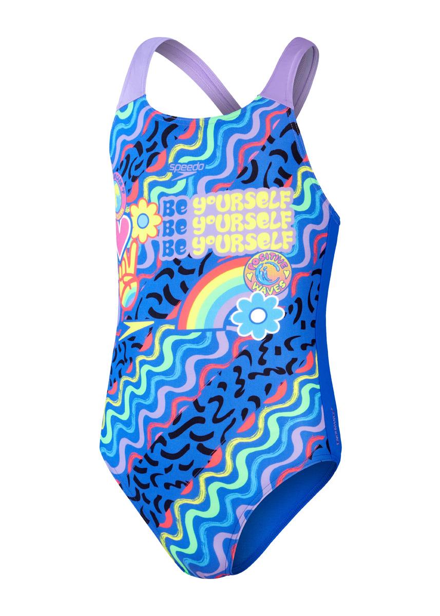 With its uplifting, colourful print and positive messaging, this Splashback swimsuit brings a burst of positive energy to lessons and training. The splashback style features straps set away from the shoulders to increase freedom of movement, allowing young swimmers to train without feeling restricted. Ideal for lessons and training, the swimsuit is front lined for comfort and modesty. Designed to be durable and better for the environment, it’s made from Speedos new ECO Endurance+ fabric, which is 100% chlorine resistant, quick-drying and made from 50% recycled materials.