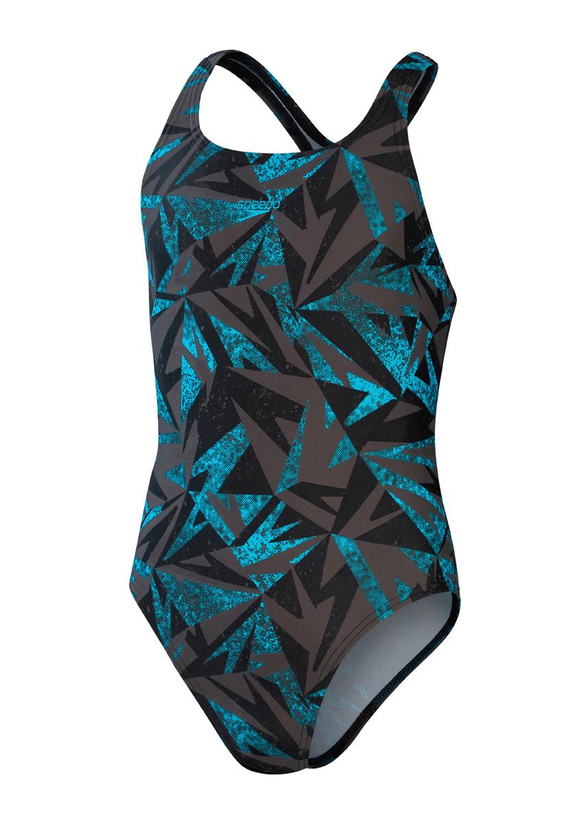 Make a statement in Boom logo prints. Celebrating the Speedo brand, Speedo sporty girls’ Medalist swimsuit showcases our iconic Boom logo in a ‘shattered’ print design with intense shades of azure blue and black. Ideal for regular pool sessions, the medalist design aids shoulder movement and flexibility so young swimmers can cruise through their swim without feeling held back. The suit is also fully lined at the front for comfort and modesty during their swim.  Soft and stretchy fabric make it ideal for regular swimming, while Speedos shape-retaining Endurance10 fabric with CREORA® HighClo™ ensures it fits like new for longer.