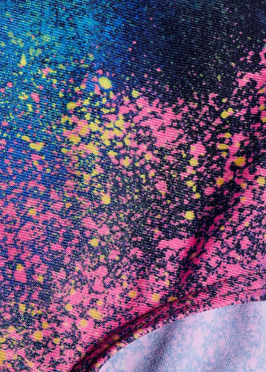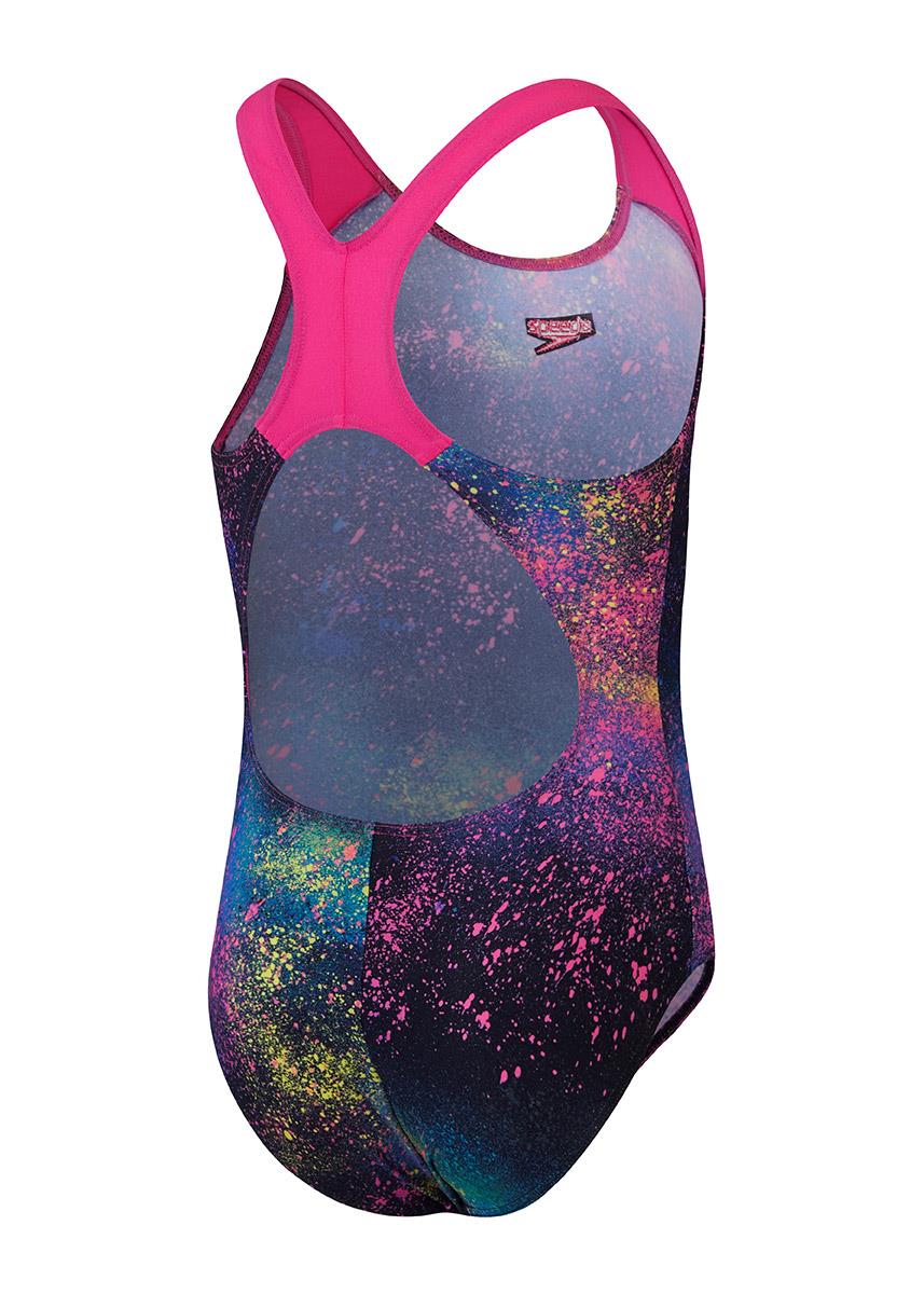 Take your swimming sessions like a star with this eye-catching black and pink all over celestial inspired print girls Speedo Splashback swimsuit.