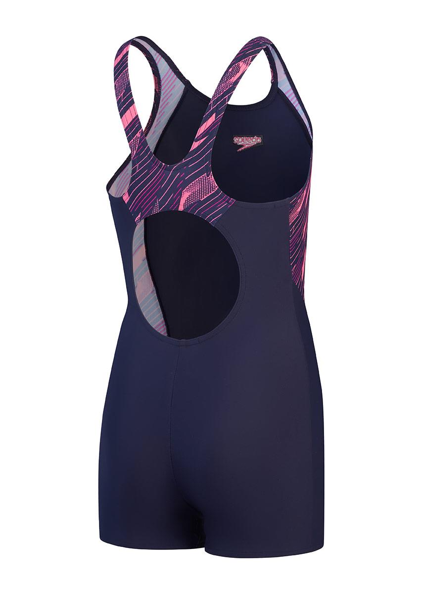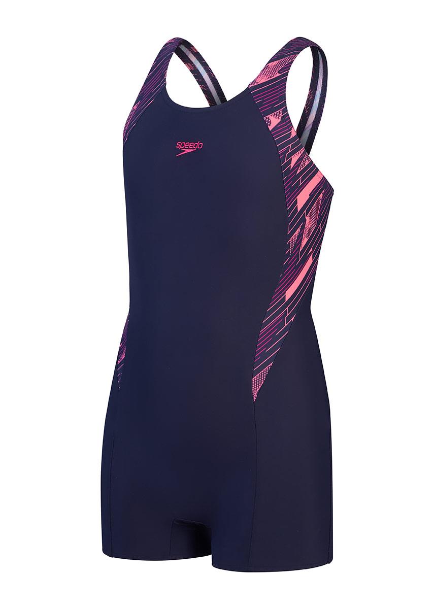 Paying homage to their legacy graphics, this sporty navy blue Speedo girls HyperBoom Splice Muscleback legsuit showcases an evolutionary HyperBoom graphic in stylish shades of pink.