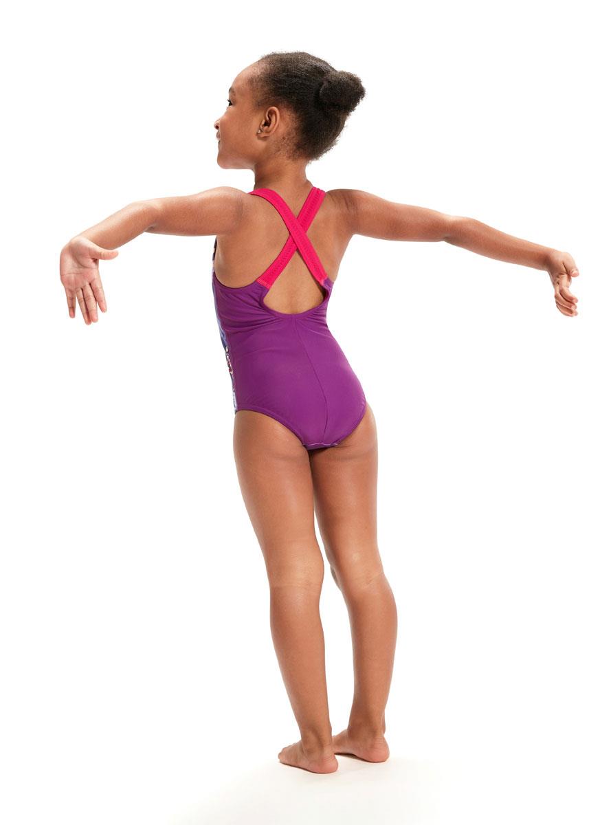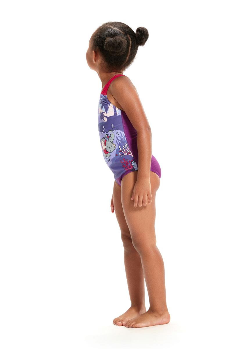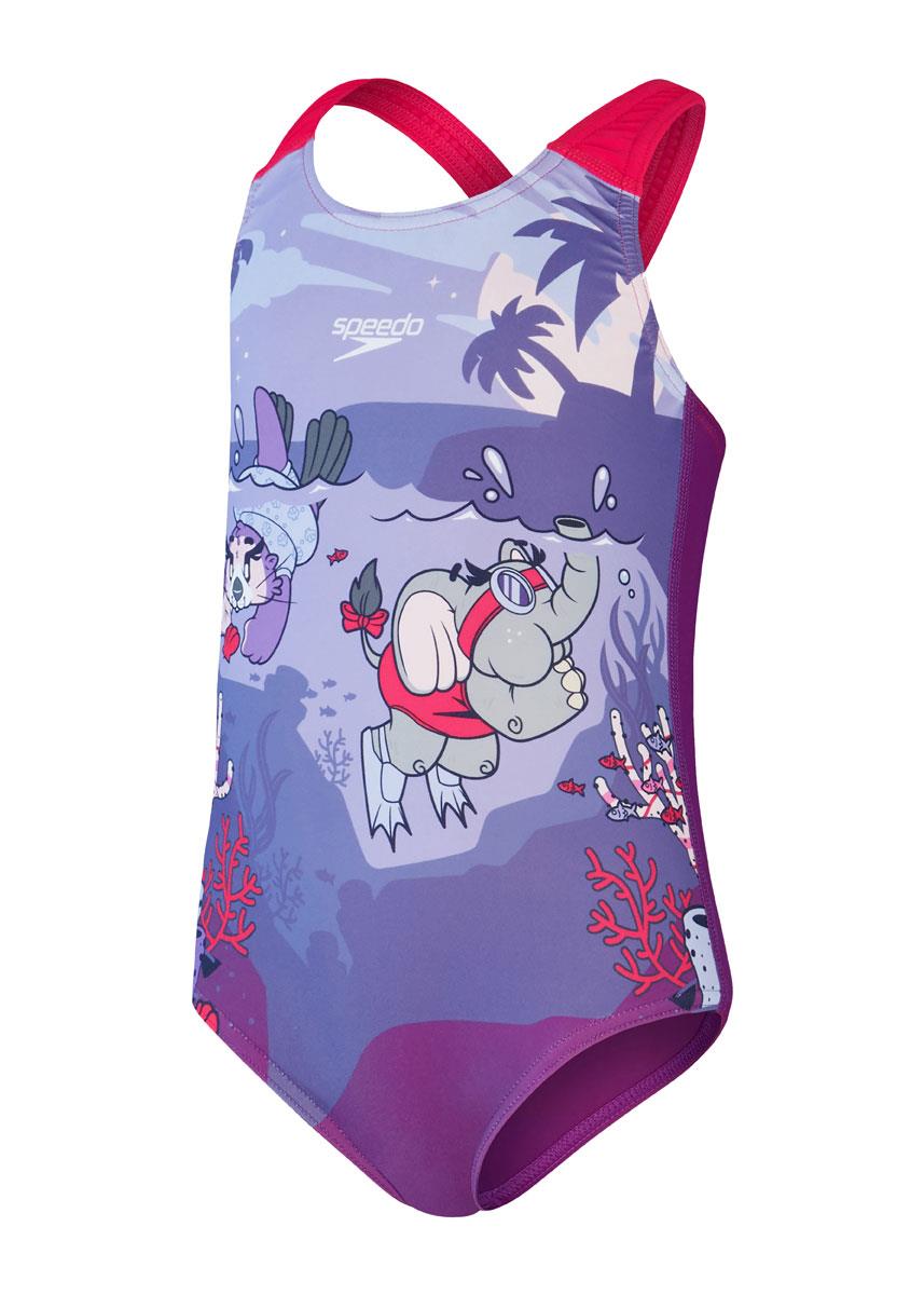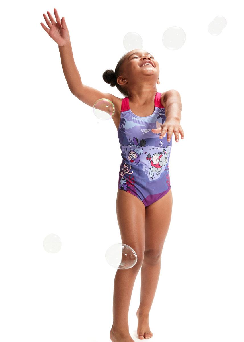 Perfect for splashing around in, this pretty junior girl’s Crossback swimsuit includes a twilight ocean scene, complete Speedo’ friendly new Aria the Otter and Ellie the Elephant characters.