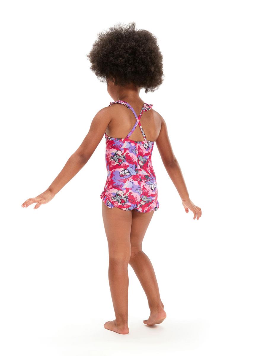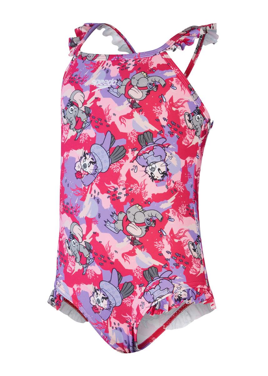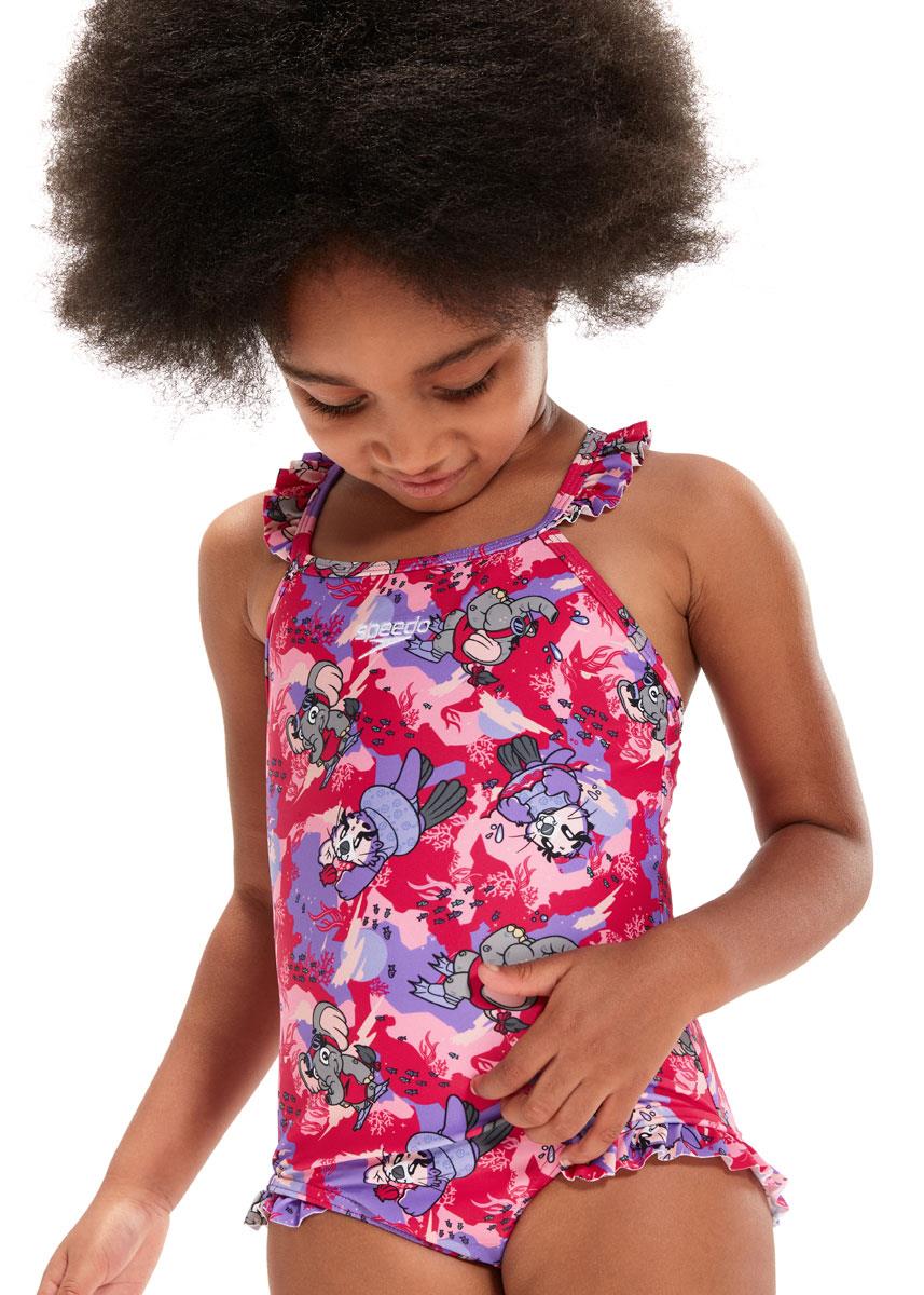 Pretty in pinks and purples, this fun Thinstrap Swimsuit is perfect for little swimmers and features Speedos fun-loving new Aria the Otter and Ellie the Elephant characters enjoying a swim down under.