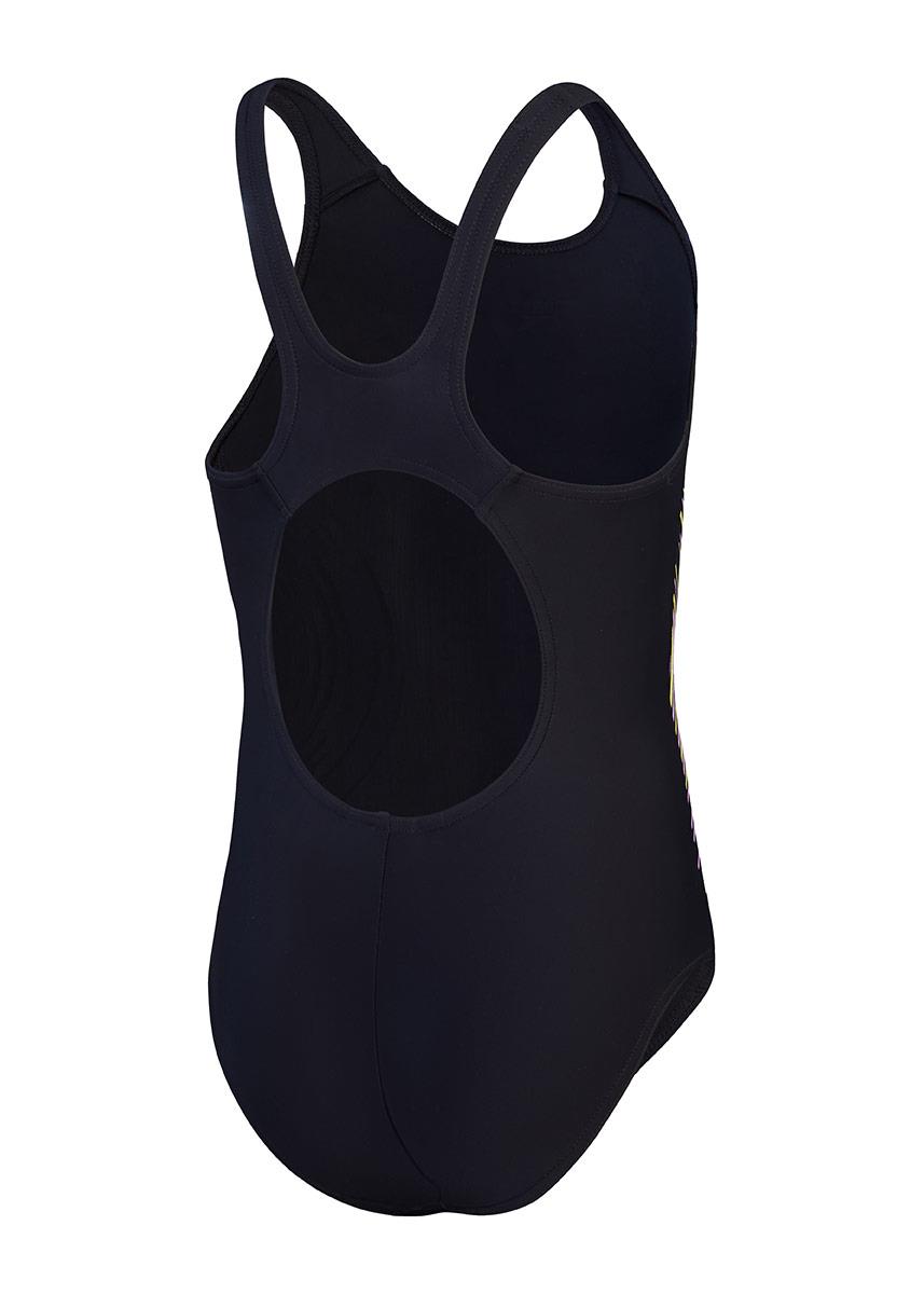 Feel confident and streamlined wearing this sporty girls Speedo Placement Muscleback swimsuit, featuring a dynamic drop-ripple graphic in vibrant yellow and lilac.