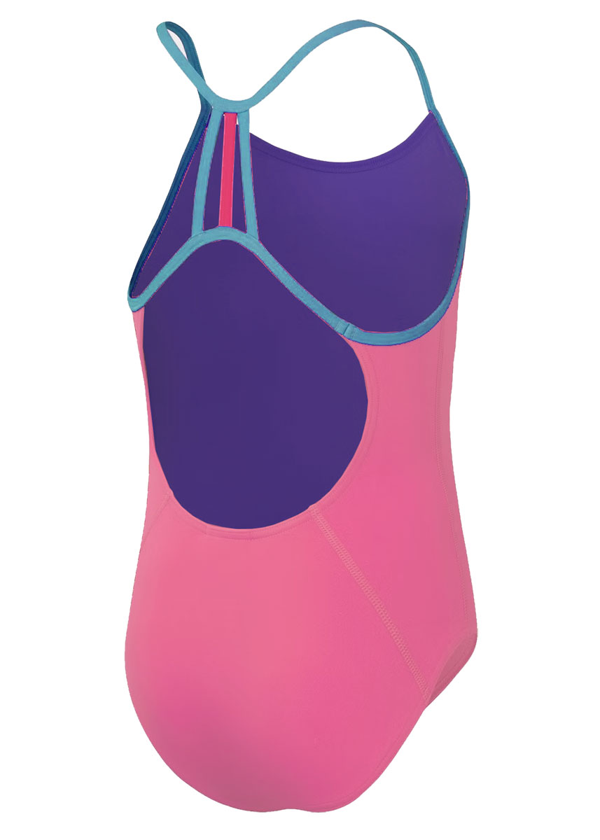 Power through training in this punchy candy pink girls Speedo Solid Lane Line Back swimsuit, featuring an elegant back strap design in contrasting turquoise.