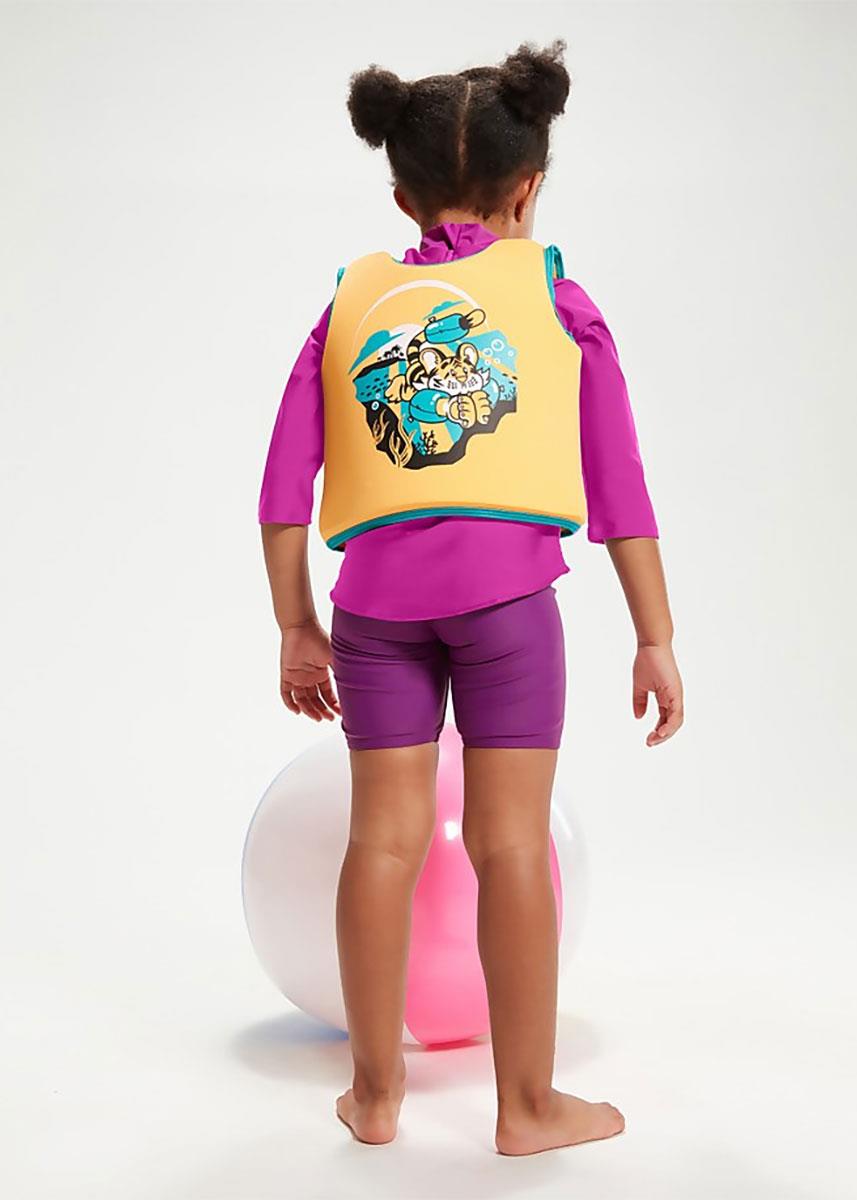 A zip-up front helps keep little swimmers secure as they’re splashing in the water.
