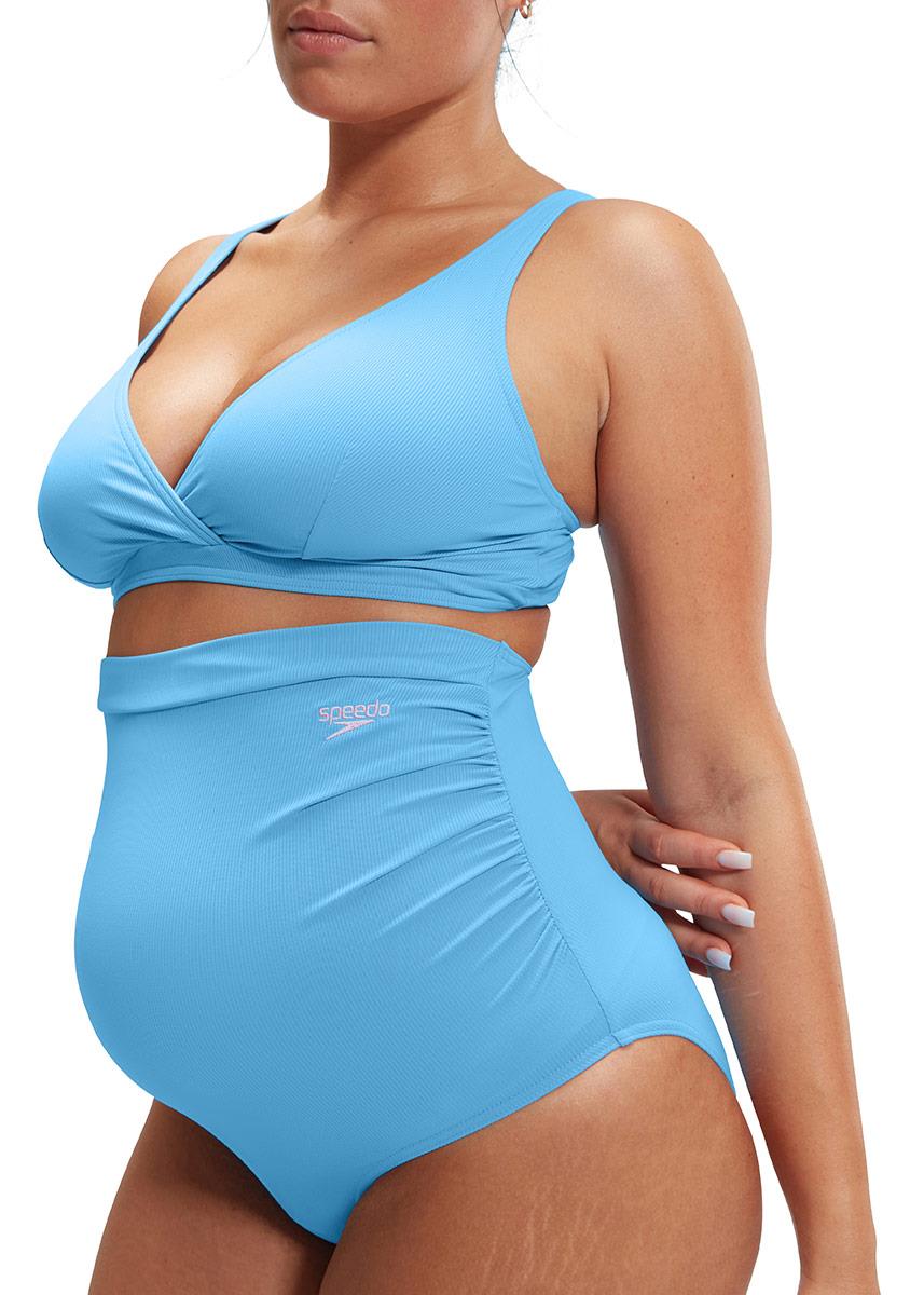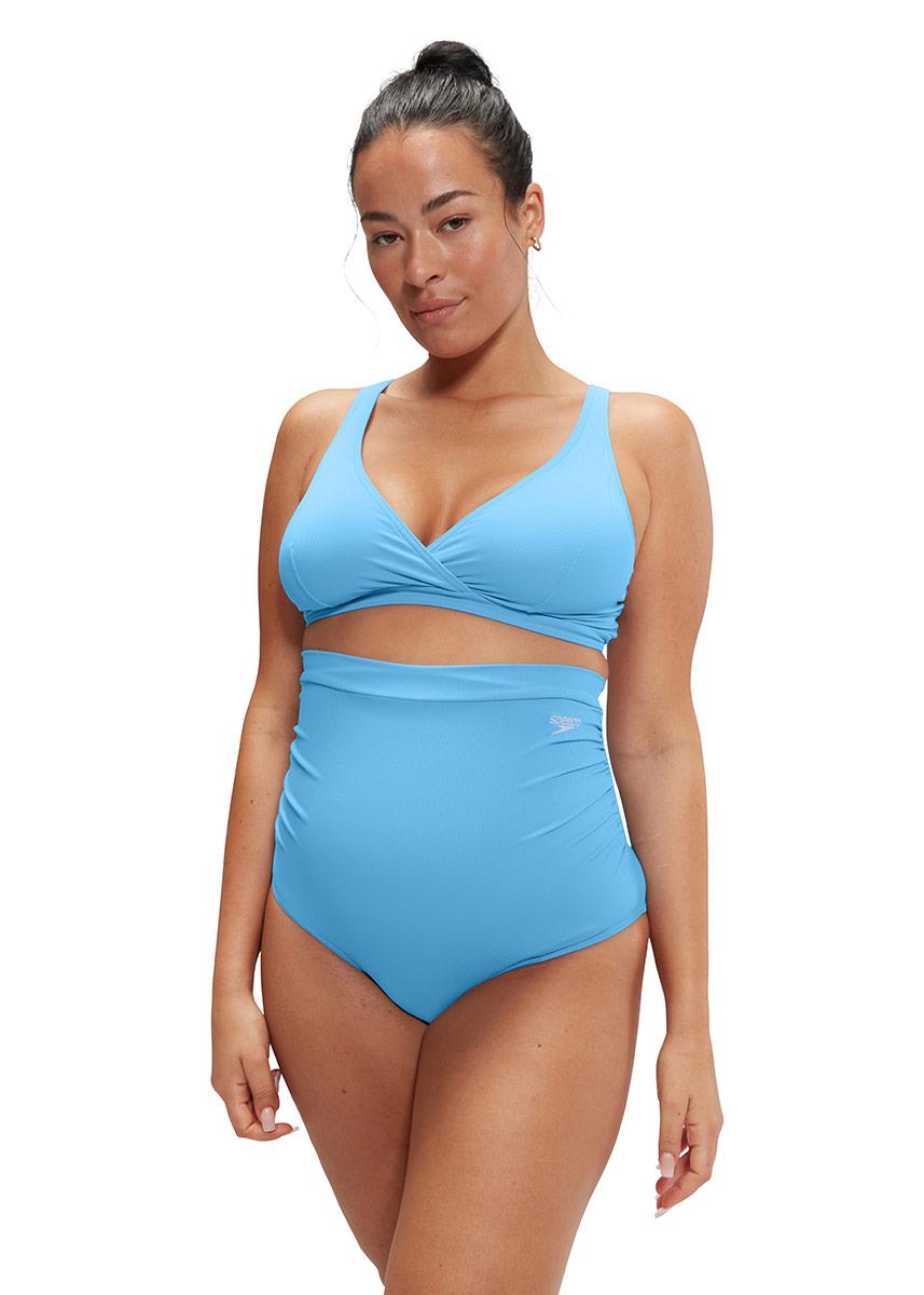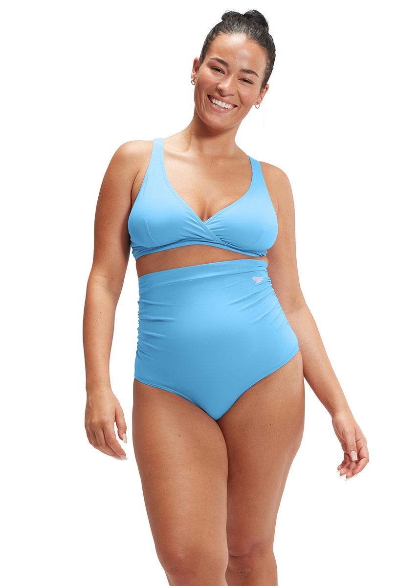 Feel fabulous in the water throughout your pregnancy wearing this stylish light blue high-waisted 2-piece swim bikini.