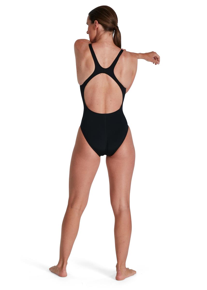 This sleek black Recordbreaker swimsuit is ideal for drills and sets, the design includes an open back and straps that sit between the shoulder blades for improved freedom of movement.