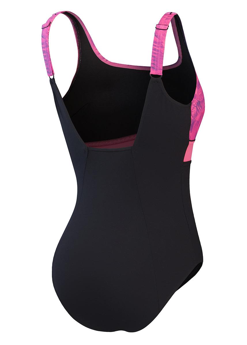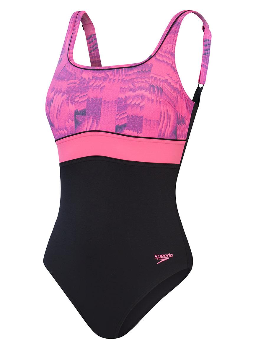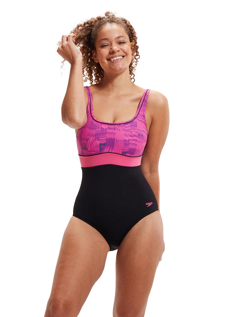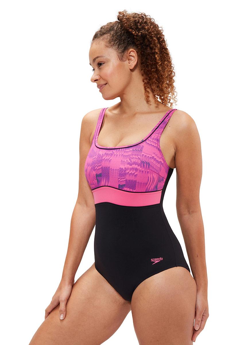 The Speedo Shaping range of swimsuits enhances, flatters and feels good all over. The sporty-look black and pink, print Speedo Contour Eclipse swimsuit includes a square neckline and uses under bust seaming to draw the eye upwards and flatter your shape.
