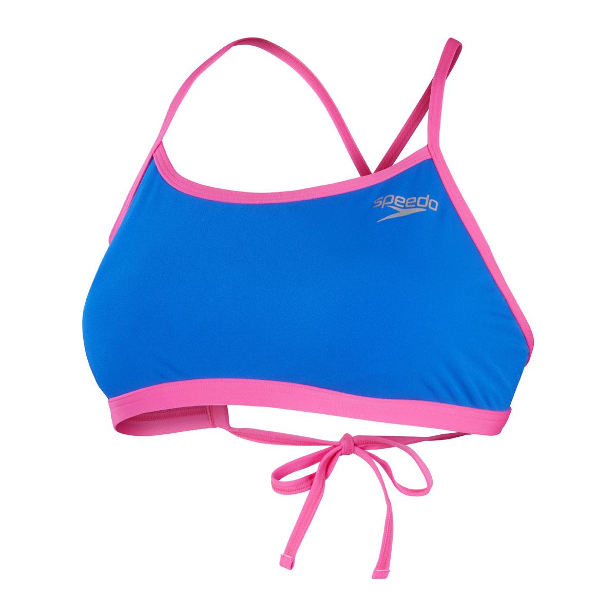 Energise your training with a pop of bold colour. Stunning in an intense blue with contrasting pink straps, this stylish Tie-back Cropped Top looks sharp the pool.