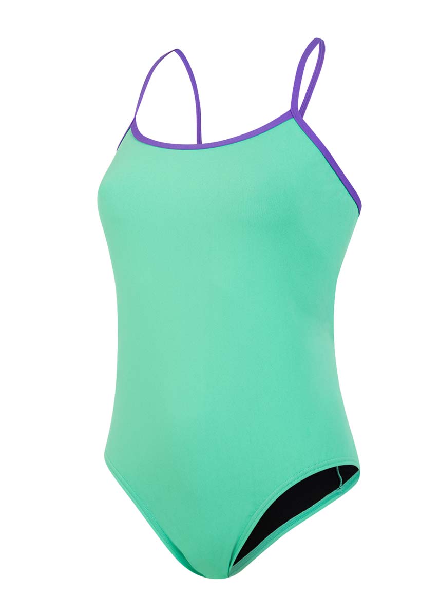This swimsuit will make sure you stand out with its vibrant green colour, contrasting the bright purple straps.