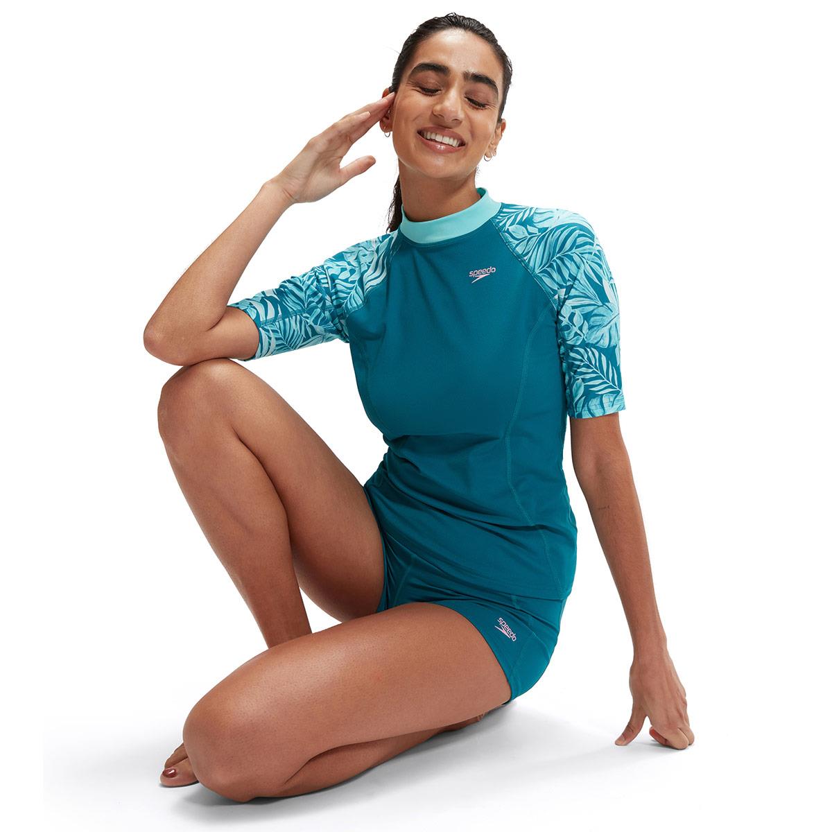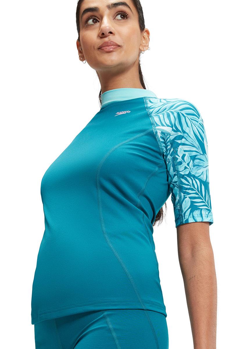 Snug-fitting in a pull-on style, this teal coloured Short Sleeve Rash top.