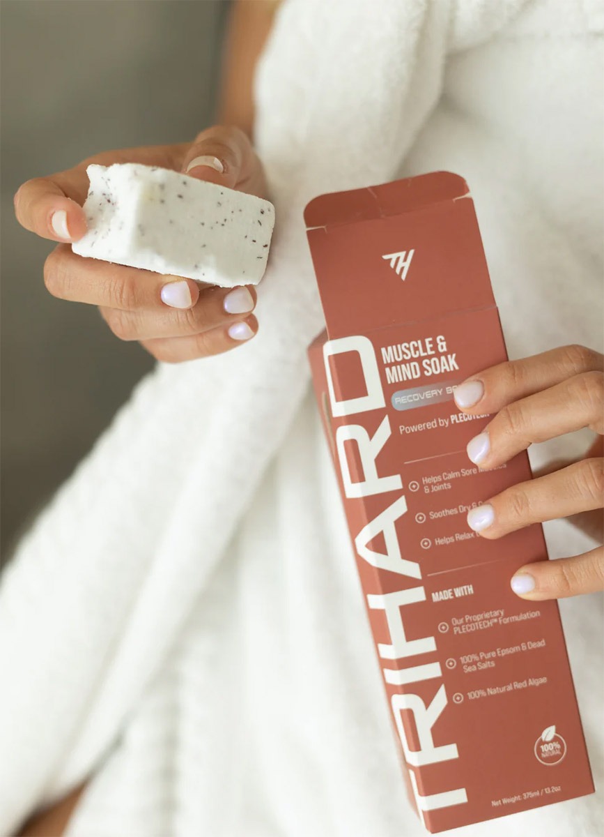 The Trihard Muscle & Mind Soak is powered by PLECOTECH™, Trihard’s proprietary patent-pending cleansing technology based on the optimal ratio of natural Red Algae, Dead Sea Minerals, and Botanical Extracts.