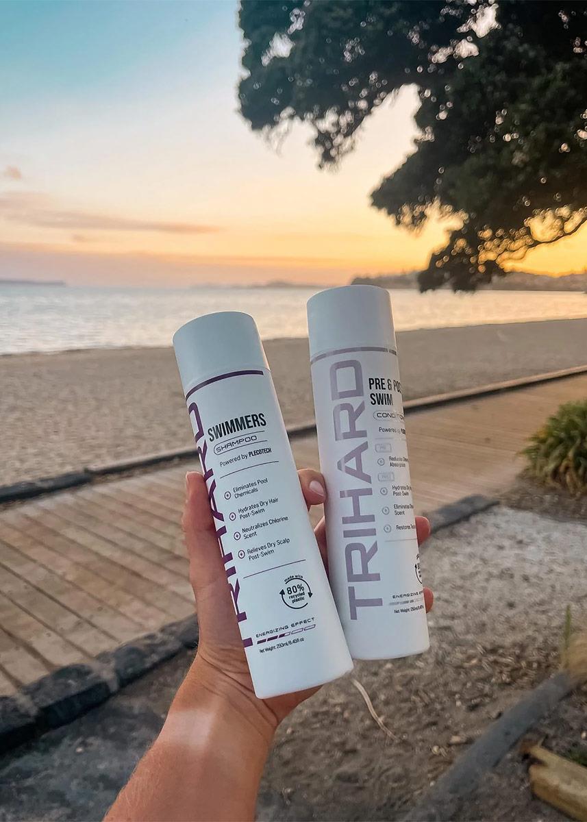 Trihards Pre & Post Swim Conditioner is powered by PLECOTECH™, their cleansing technology, includes Red Algae, Dead Sea Minerals, and Botanical Extracts.