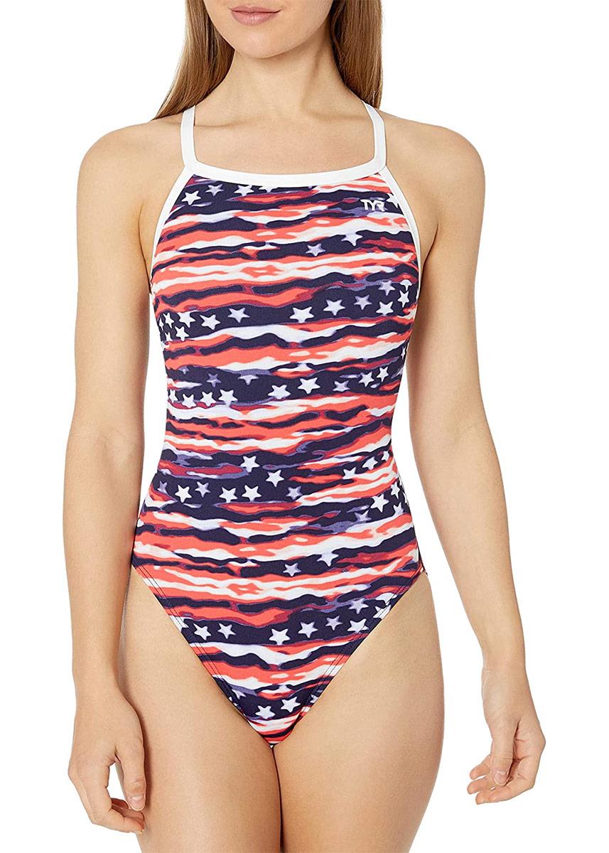 Take on every challenge with the TYR All American Diamond fit Swimsuit in red, white, and blue.