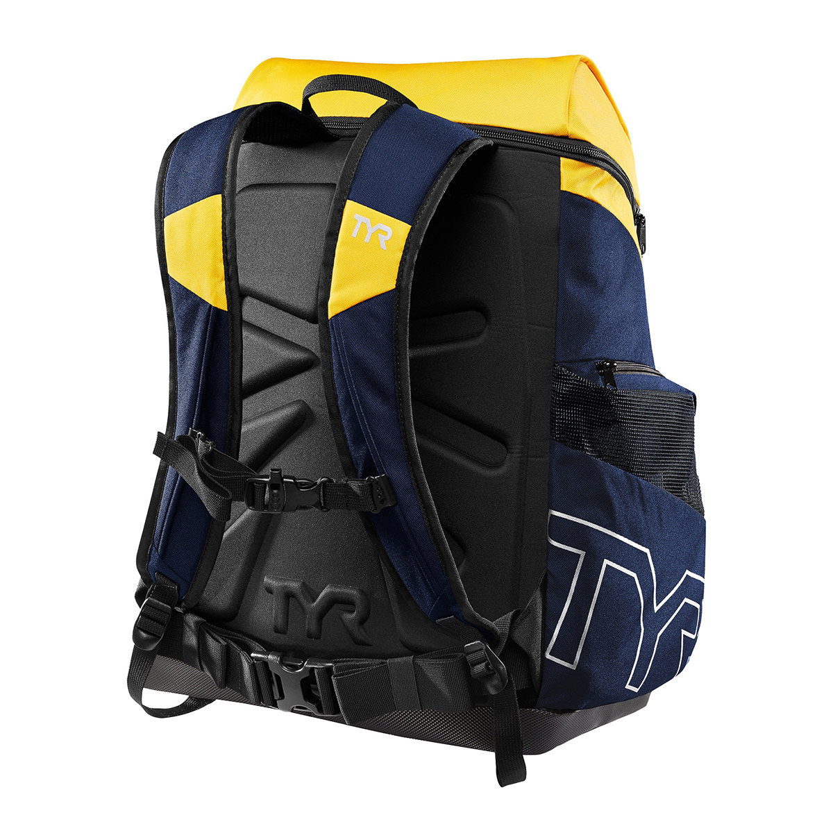 Always be ready with this Navy Blue and Gold print TYR Alliance 45L backpack perfect for swimmers and triathletes to transport their swim gear and training equipment. This TYR backpack has been packed with state of the art features especially engineered for athletes on the go. With a cutting-edge, space saving design, the 45L maximises storage without the bulk.
