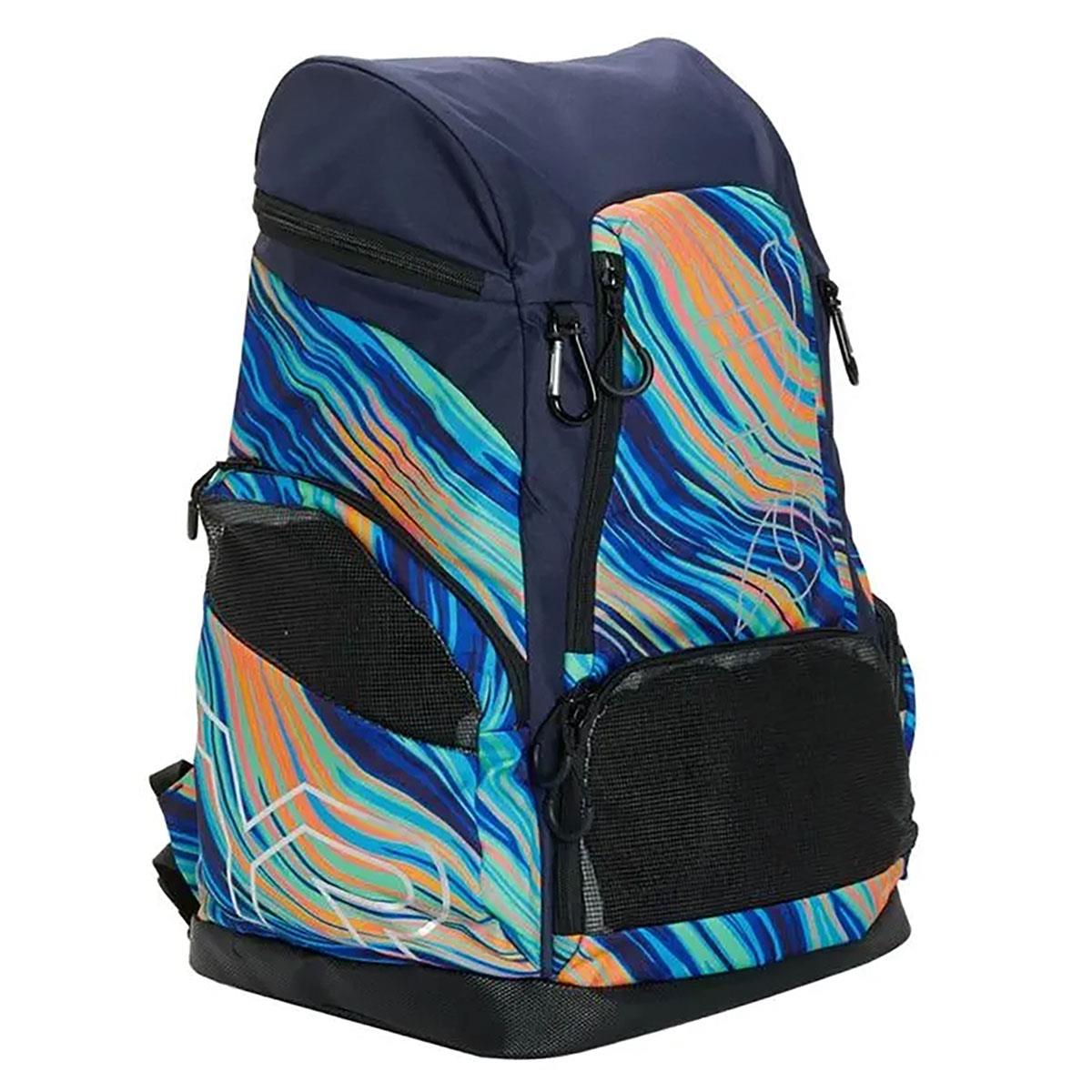 This TYR Alliance 45L Backpack is Teal and Orange is a stylish and versatile swim bag with a limited edition Riptidal print. This TYR backpack has been packed with state-of-the-art features especially engineered for athletes on the go. With a cutting-edge, space-saving design, the 45L maximises storage without the bulk.