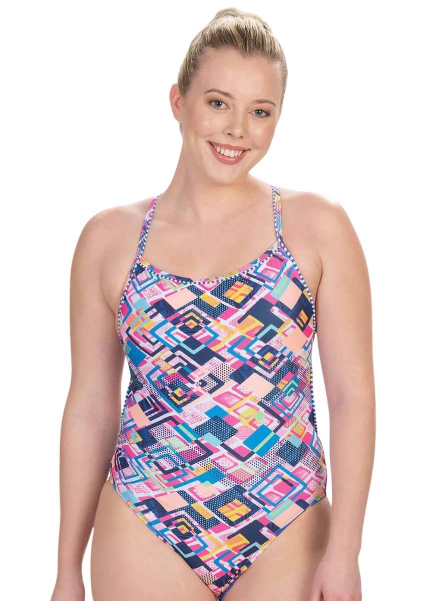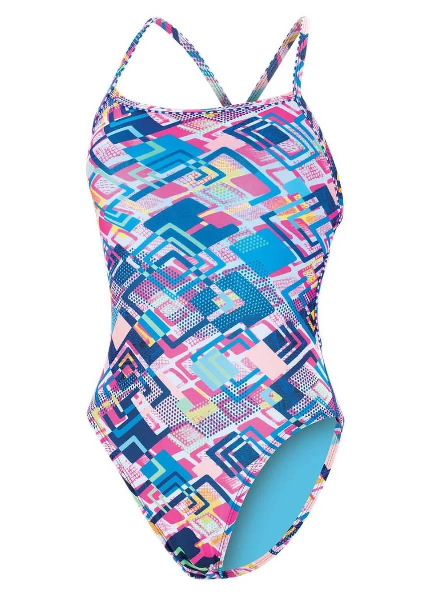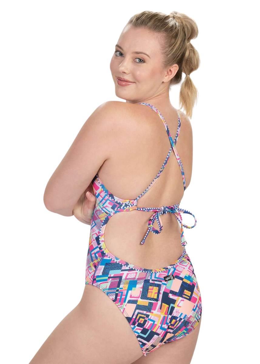 This vibrant Dolfin Revibe Tie Back swimsuit features a colourful abstract floral design.