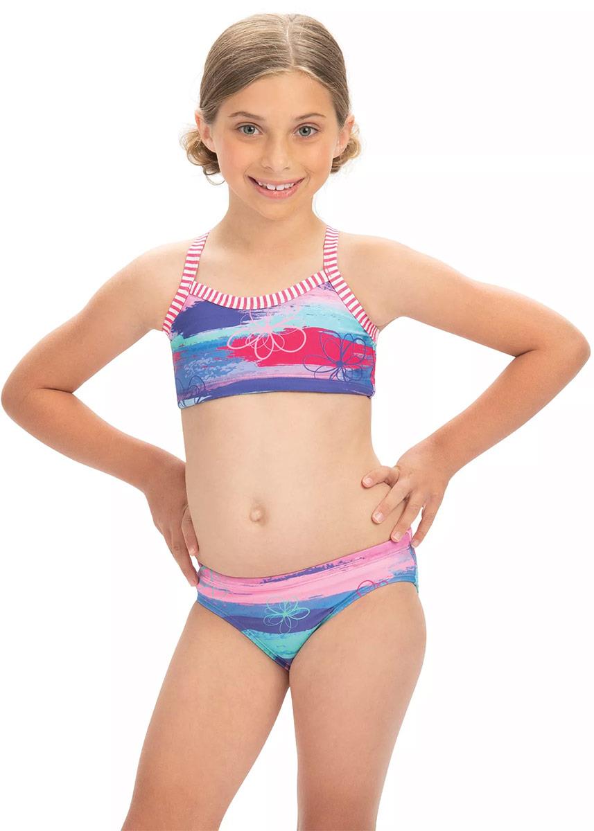 The girl’s Dolfin Surfs Up print 2-piece Swim bikini is the perfect choice for young swimmers looking for a new, durable swimsuit to take to the pool or beach. Young swimmers will love this junior swimsuit’s cheerful floral mix print with signature candy stripe binding.