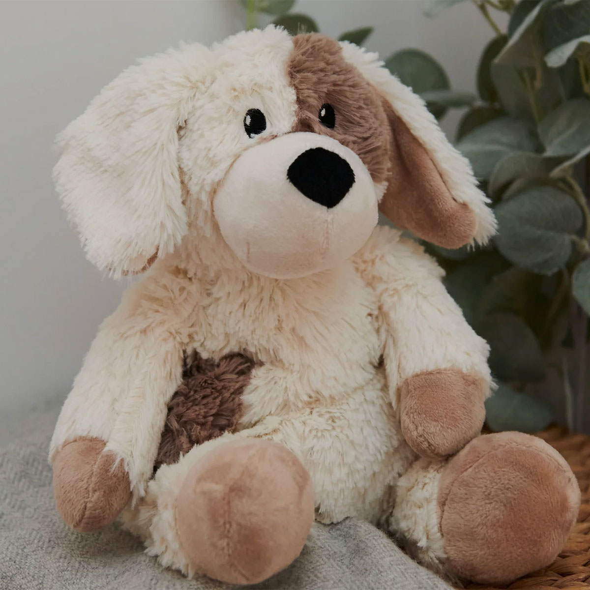 The warmies range is a range of fully microwaveable soft toys. This lovely puppy is made from high quality cream plush and has a contrasting brown patches, one across his eye and others on his body.