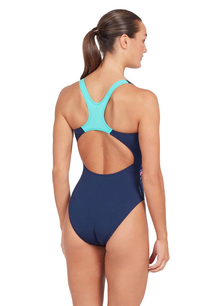 The Zoggs Liquidity Actionback swimming costume combines sport and style! Sleek, strong and feminine with a print representing the fluidity of water.