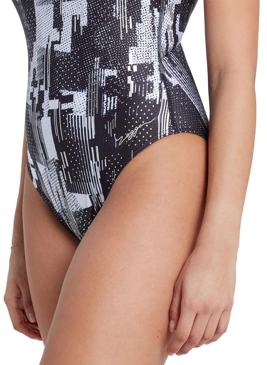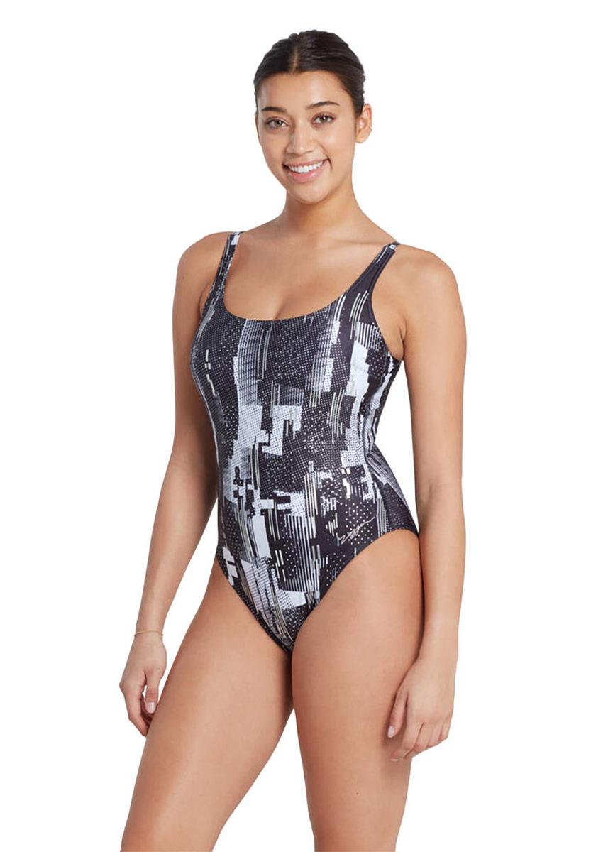 The Zoggs Shimmer Sleekback swimsuit features an eye-catching black and white Shimmer print that will turn heads at the pool.
