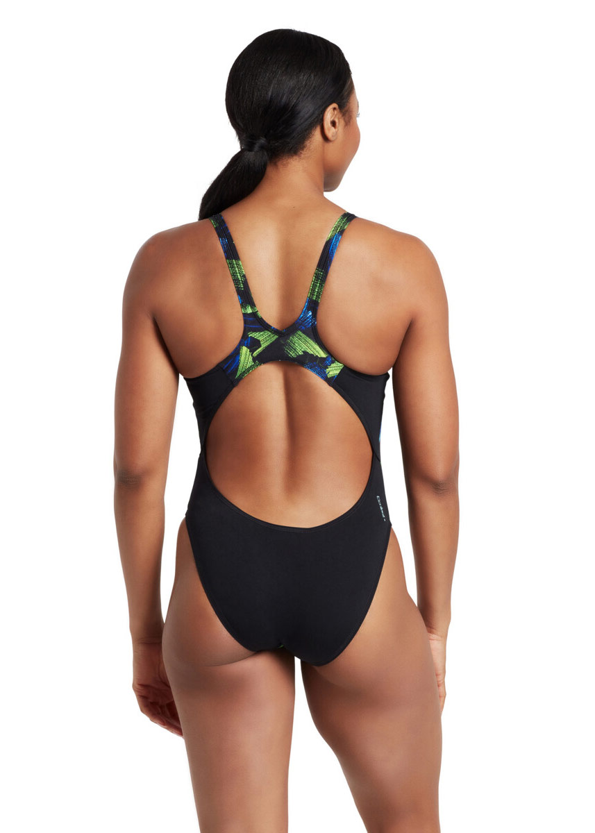 Made from Zoggs sustainable Ecolast™+ fabric with recycled plastic bottles, this one piece swimsuit is 100% chlorine and UPF 50+ resistant .