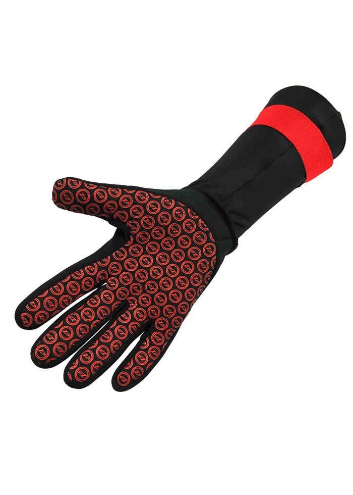 The longer length of the gloves paired with the velcro strap stops the age old problem of open water gloves ballooning with water slipping off. The increased length allows you to tuck the gloves over or under your wetsuit to ensure there is no exposed skin.