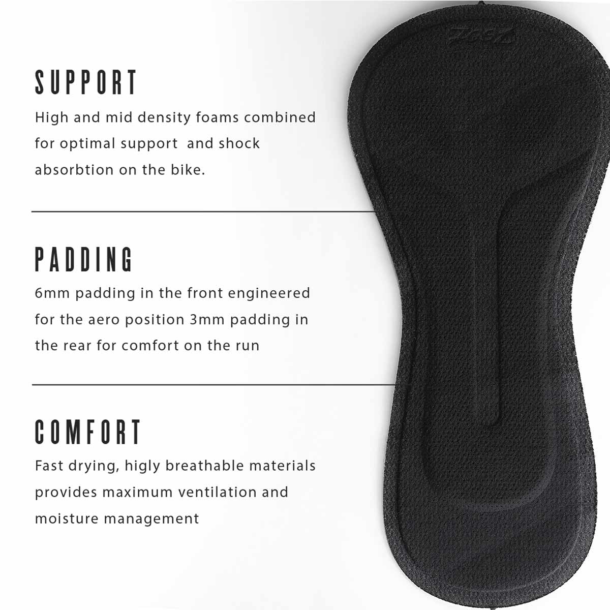 The NEW LTD TRI CHAMOIS is fast drying, highly breathable and is exclusively designed for ZOOT in Italy. Engineered with mid density, low-water absorption foam for optimal support and shock absorption on the bike. Providing extreme comfort and a low profile on the run, while still providing the required cushioning for long distance racing.