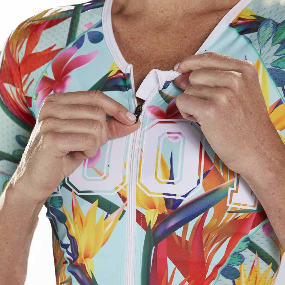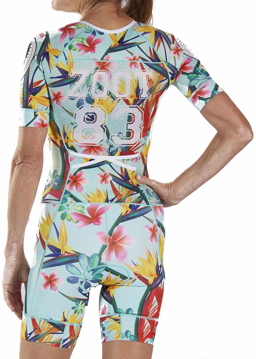 The Zoot Women’s 83 LTD Tri Aero Racesuit provides maximum comfort and freedom on race day. The racesuit is aero-cut with textured sleeves to reduce surface tension and increase speed on the bike.