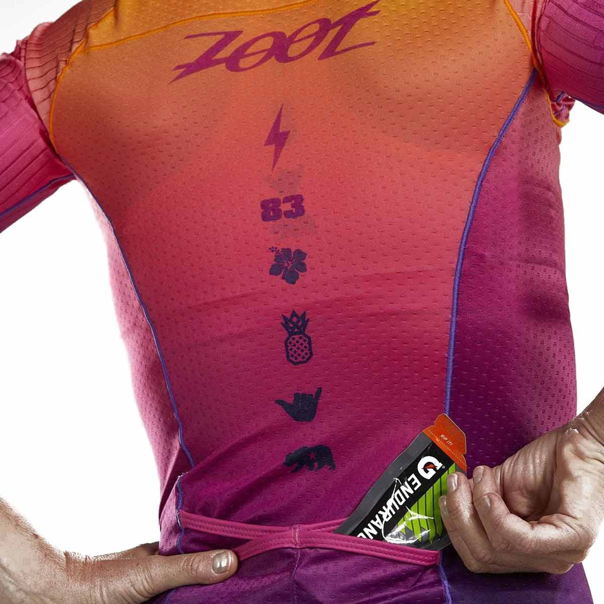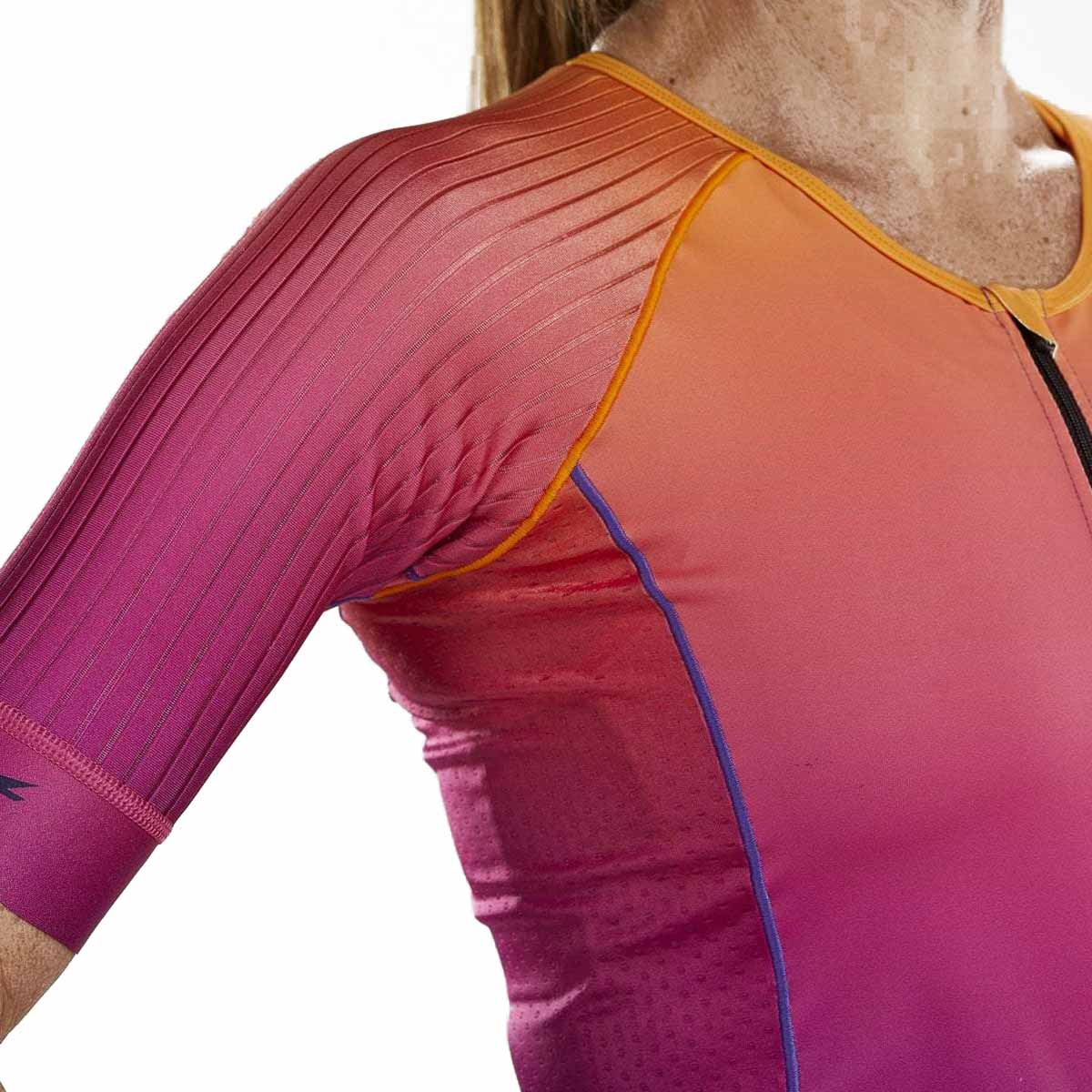 The Zoot Women’s Sunset LTD Short Sleeve Aero Jersey promises to maximise your potential on race day! The ribbed structure of High Speed Light Aero fabric is placed in critical areas of the garment to reduce the vortex of air, which is generated behind the athlete and, consequently, reduces drag and saves watts.
