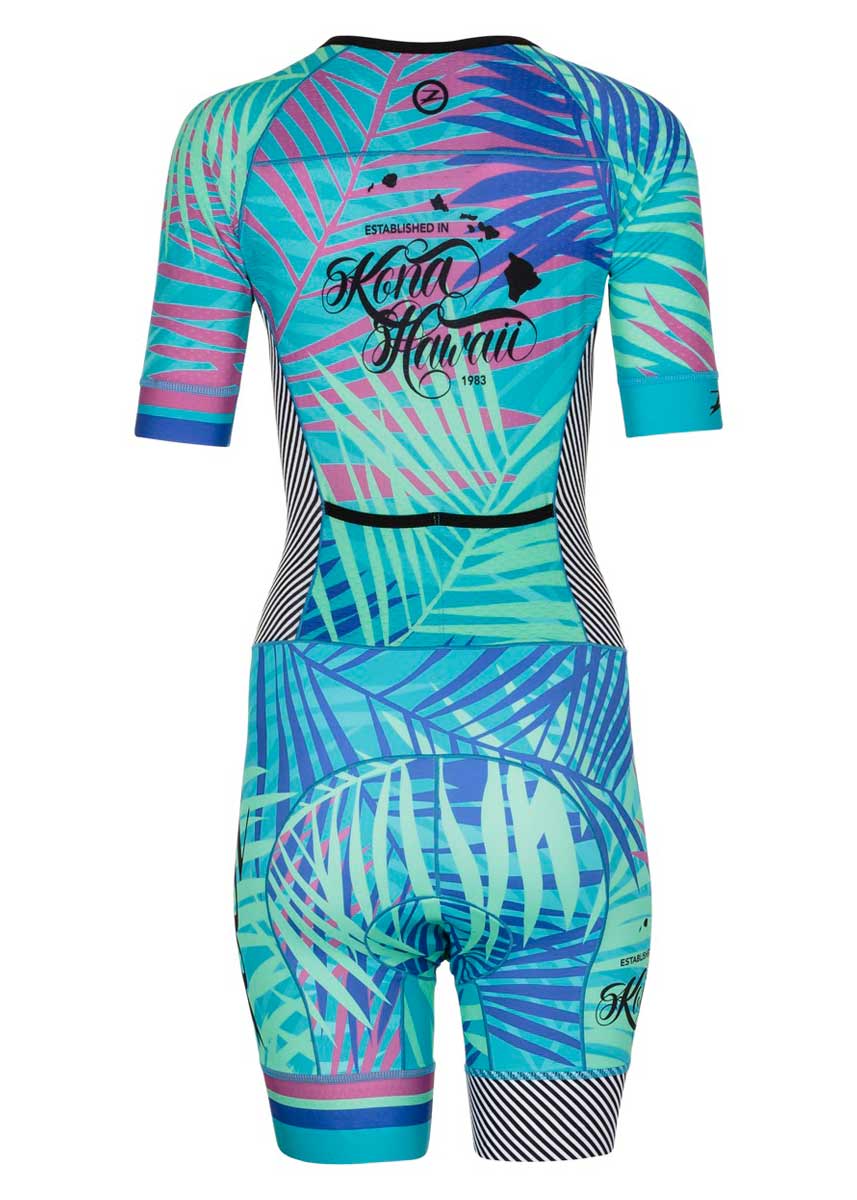 The Zoot Women’s Ali Tri Racesuit in the palm print design is a perfect choice for race day